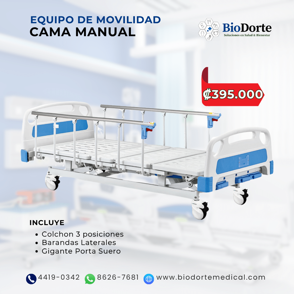 La Cama Hospitalaria Manual de 3 Posiciones BioDorte es un equipo médico diseñado para brindar seguridad, comodidad y soporte durante el cuidado de pacientes en el hogar, clínicas u hospitales. Su sistema de ajuste manual permite elevar el respaldo y las piernas, facilitando el descanso, la recuperación y la atención diaria.